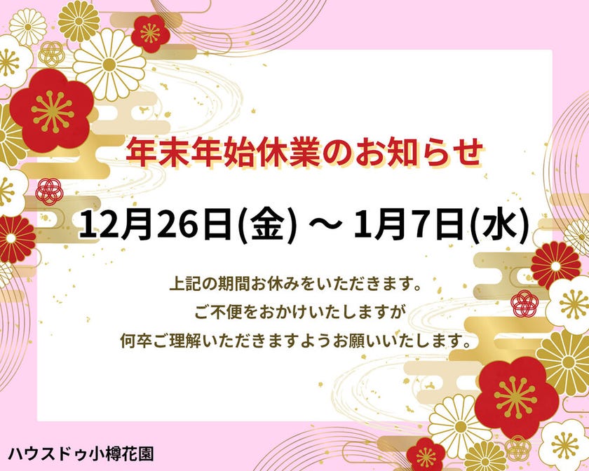 弊社は12月26日(金)~1月7日(水)までを年末年始休業日とさせていただきます。